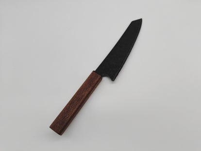 Die geschwärzte Klinge verleiht dem Messer nicht nur einen ausdrucksstarken, rustikal-edlen Look, sondern schützt die Oberfläche zusätzlich vor Korrosion. Die charakteristische Kiritsuke-Form – mit ihrer langen, flachen Schneide und der markant abfallenden Spitze – macht das Messer besonders vielseitig: