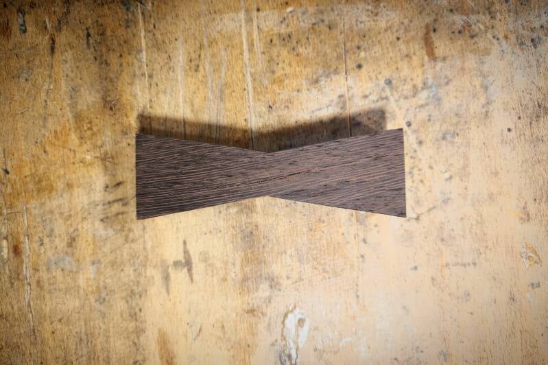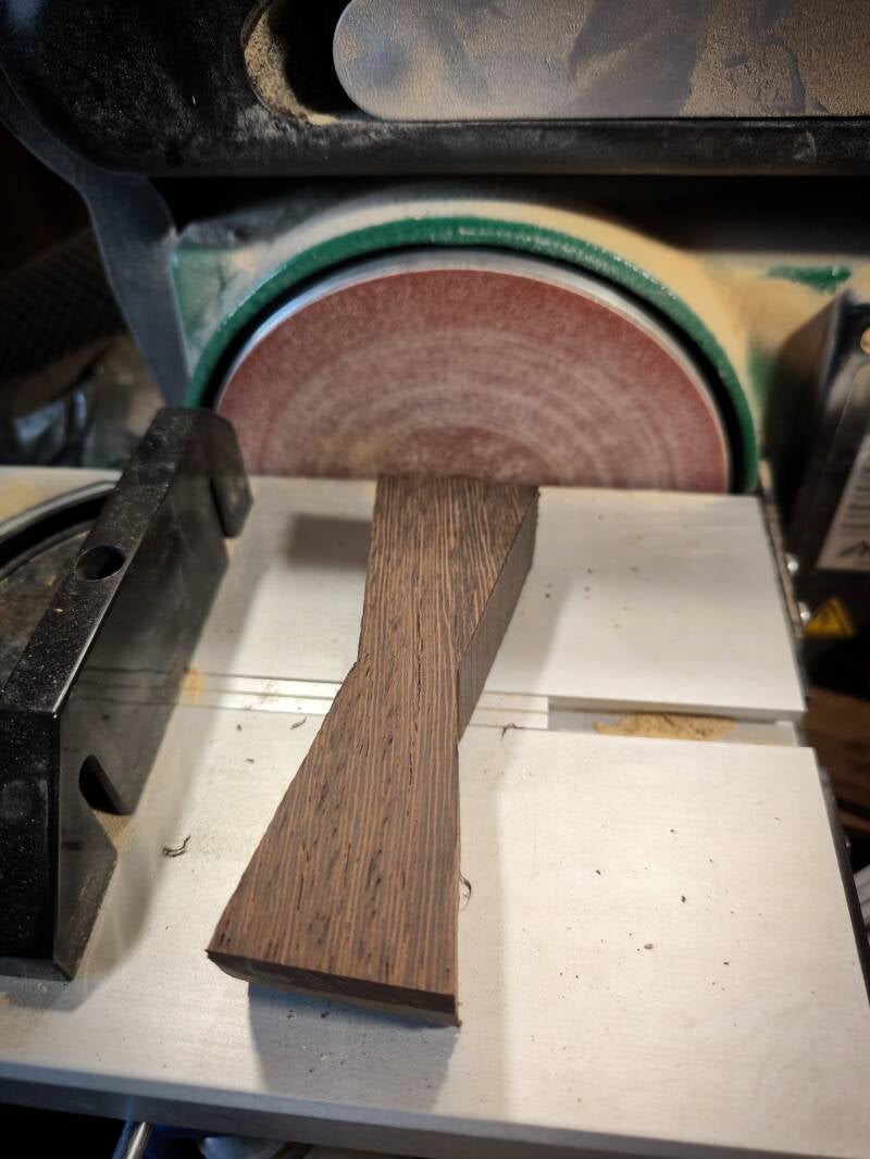 Nun habe ich das Ebenholz an meiner Bandsäge entlang der Markierung zugesägt, die Stirnseiten & die Oberfläche mit meinem Bandschleifer bearbeitet. Danach habe ich mit einer Feile die Längsseiten geglättet und auf der Unterseite abgeschrägt. Die Unterseite erst bearbeiten nachdem ihr (falls nötig) die auf das andere Werkstück übertragen habt. Verwendet dazu einen Cutter um möglichst nah am Butterfly die Markierung zu machen.