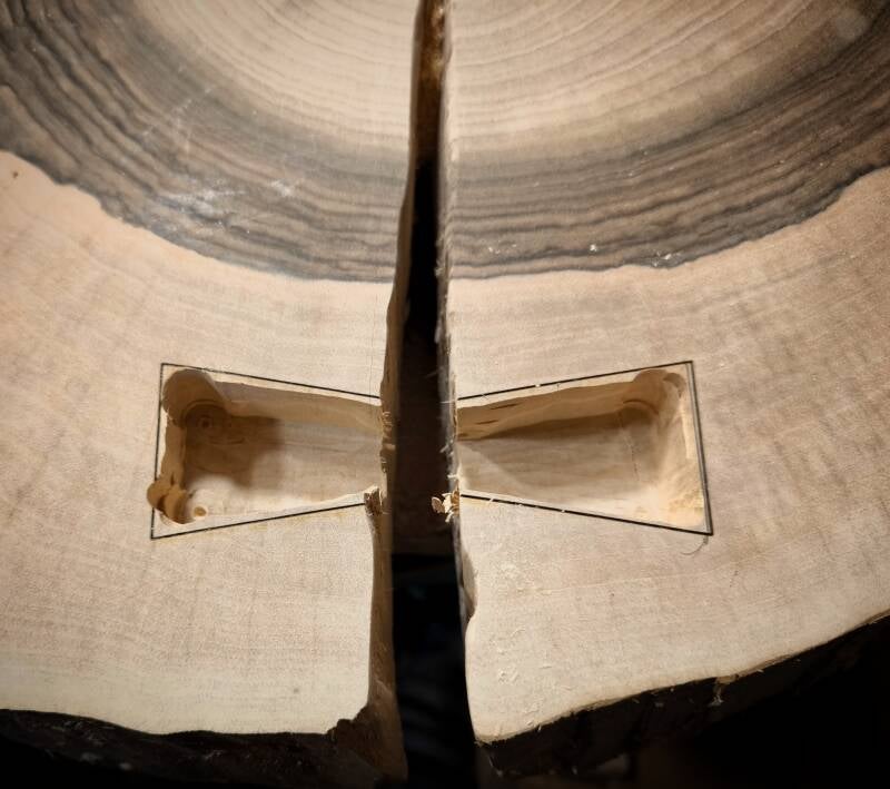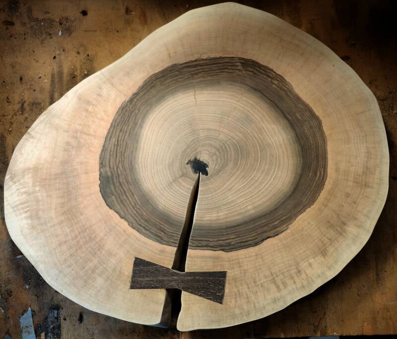 In meinem Beispiel habe ich eine Walnuss Holzscheibe aus der ein kleiner Couchtisch werden soll. Leider hat diese Holzplatte einen starken Riss beim Trocknen bekommen. Um die Platte zu stabilisieren habe ich mich dazu entschlossen ein Butterflyinlay aus Ebenholz einzulassen. Somit sollte der Riss stabilisiert werden und es entsteht zudem eine sehr schöne Optik.