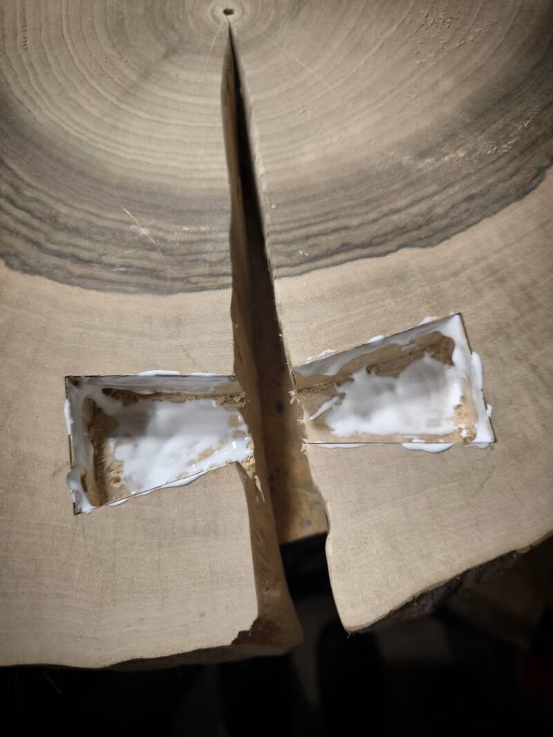 Wenn das Inlay nun fast reingeht und ihr merkt mit zwei, drei Hammerschlägen sitzt das gute Stück, bringt ihr schön Holzleim auf und klopft das Stück vorsichtig mit einem Stück Holz rein. Bei mir hat es gefühlt perfekt gepasst. Ich habe nun die Kanten mit zuvor gesammelten Holzstaub etwas benetzt um kleine Ungenauigkeiten gleich auszubessern.