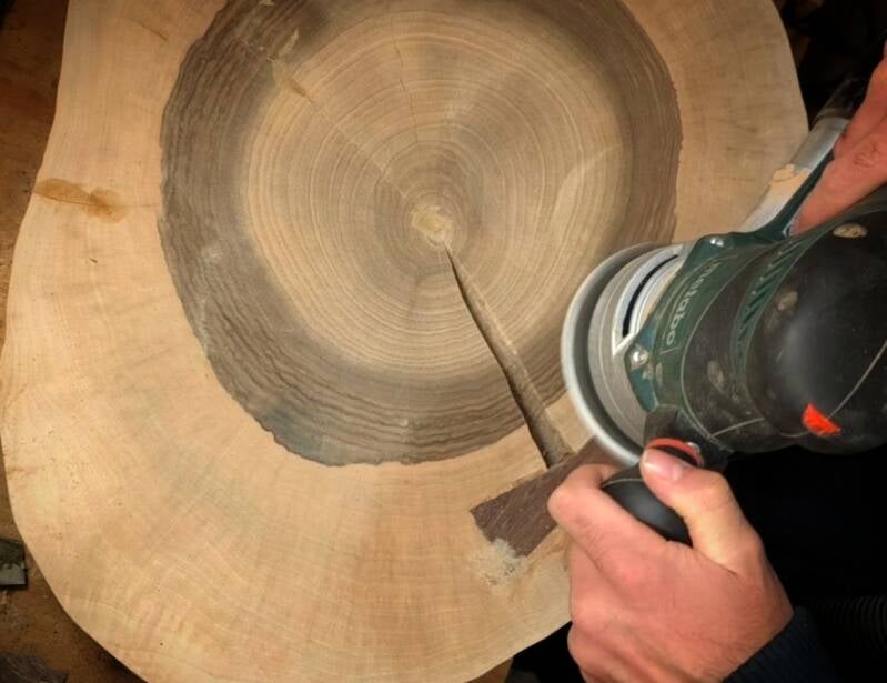 Nun schleife ich das Inlay mit einem Exzenterschleifer und Korn 120 schön bündig. Falls noch mehr als 1-2mm überstehen einfach mit einem Hobel abziehen und dann überschleifen.