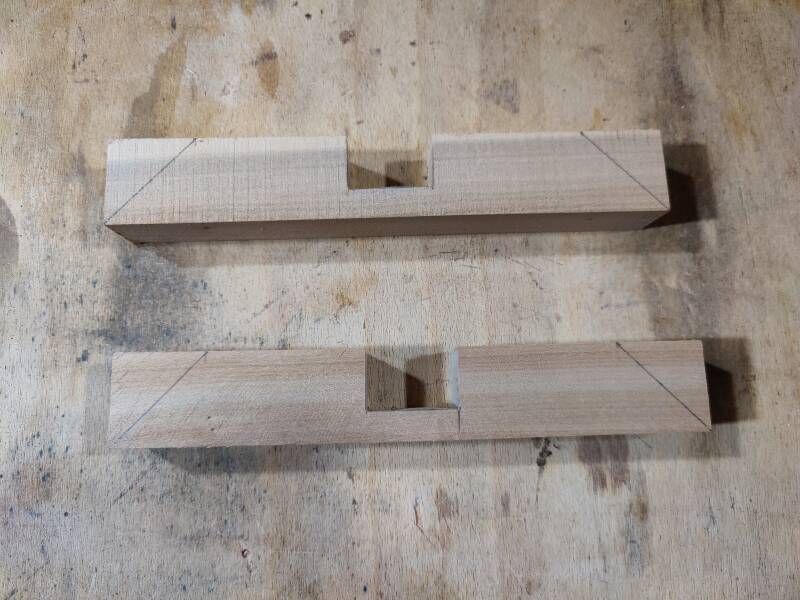 Die Füße werden auf das Kopfteil gesteckt, daher habe ich das Holz an dieser Stelle ausgesägt. Aus optischen Gründen habe ich ausserdem noch die Enden abgeschrägt, damit das ganze nicht so wuchtig wirkt.