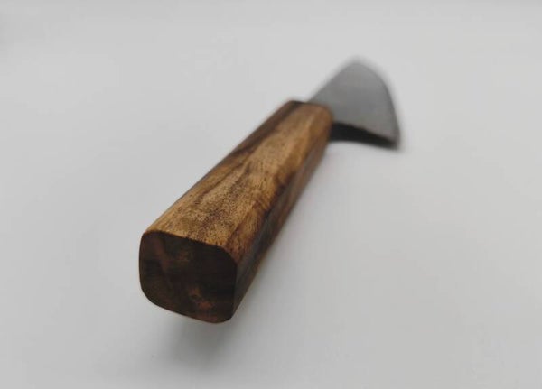 Der handgefertigte 8-Kant Griff aus Walnussholz bietet nicht nur eine warme, elegante Optik mit natürlicher Maserung, sondern auch hervorragenden Halt und Komfort bei langen Schneidarbeiten. Seine facettierte Form liegt sicher in der Hand und sorgt für präzise Führung bei jedem Schnitt.